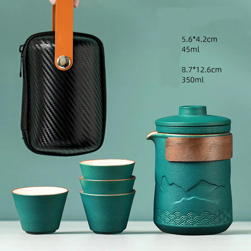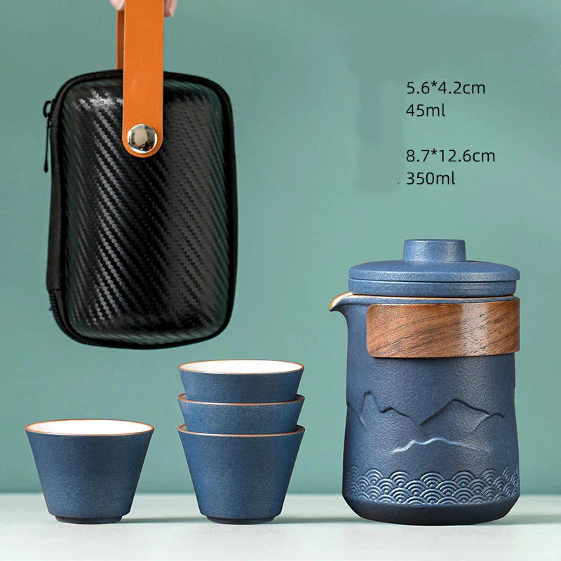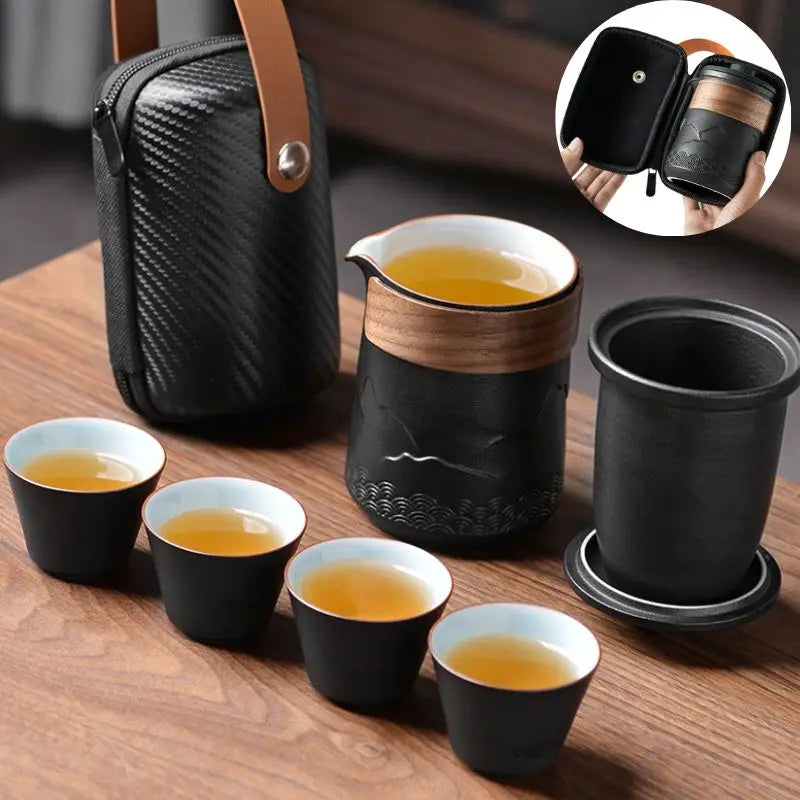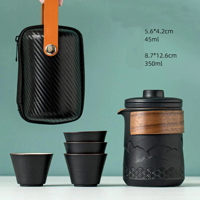 Elegáns utazó teáskészlet matt kerámiából, fa részletekkel. Tartalmaz egy teáskannát beépített szűrővel, négy csészét és egy kemény táskát utazáshoz való rögzítéssel. Alkalmas egy hétvégére otthonról, az irodába és kirándulásra.